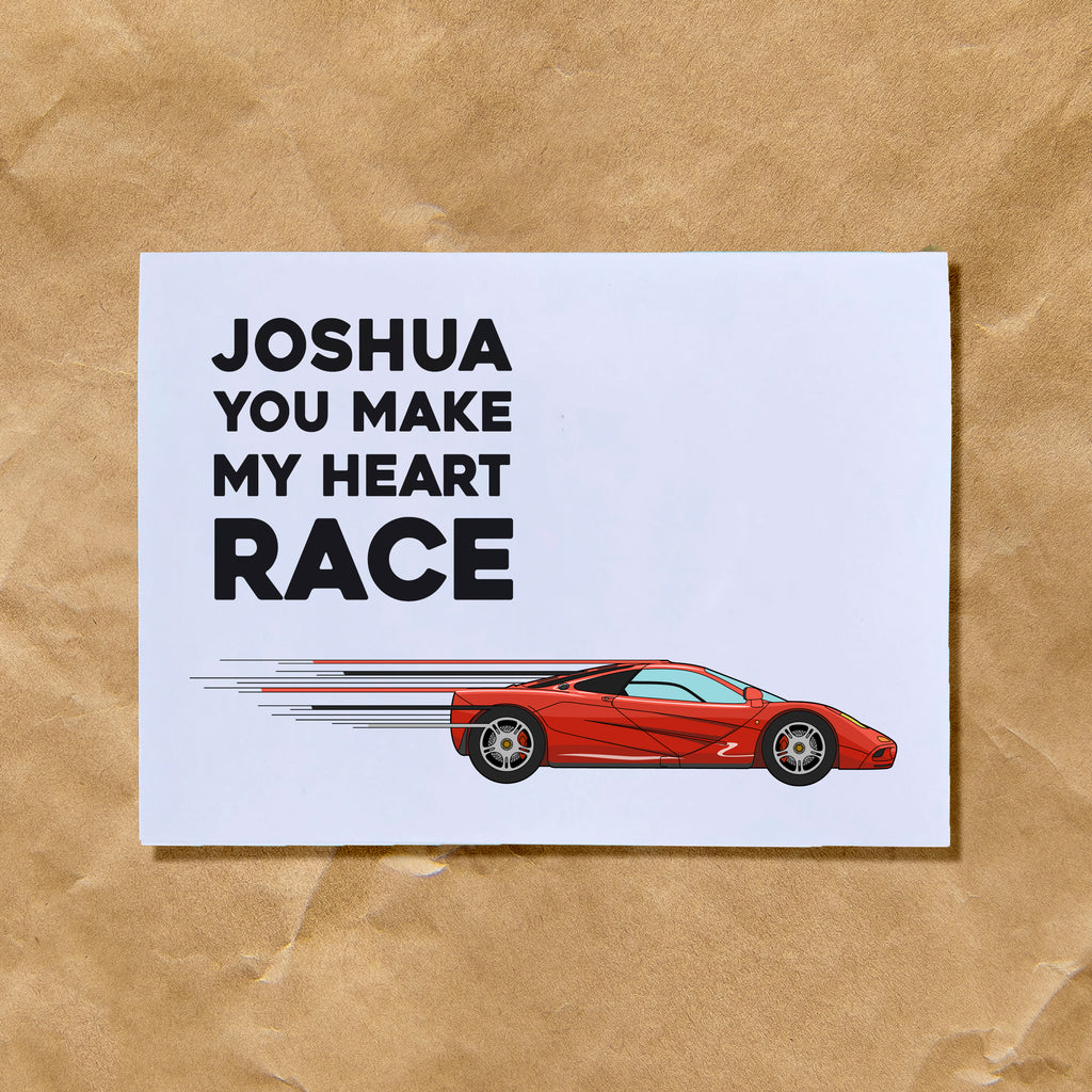 Personalise your card with the recipient's name above the message 'You make my heart race'. The card features the iconic McLaren F1 in Grand Prix Red.